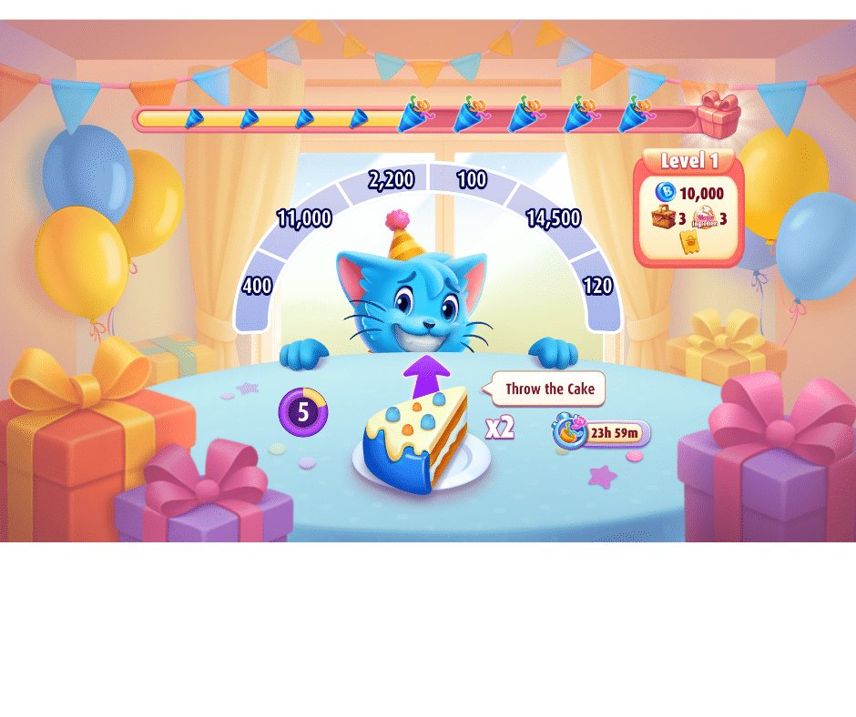 Each Bingo scored lets you join the birthday fun! Aim and throw the Cake in the Bonus Game, hit the highest numbers, and unwrap incredible rewards!